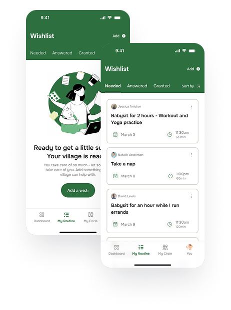 Invite friends, family, and neighbors to your circle. Share wishes—like meals, errands, or childcare—with your village.